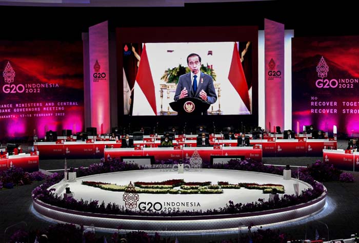 2月17日,印度尼西亚总统佐科在二十国集团(G20)财长和央行行长会议上进行线上致辞。 新华社发(印度尼西亚财政部供图)