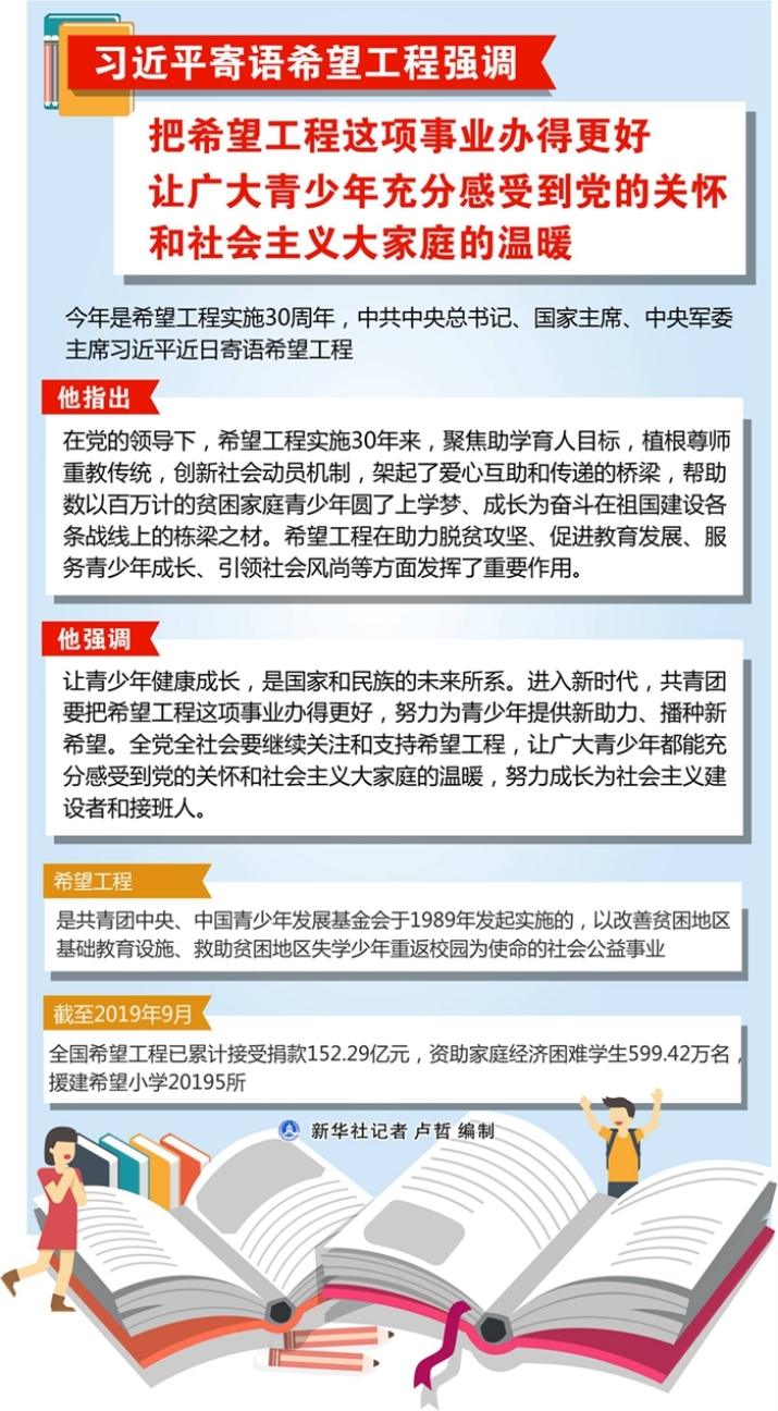 希望工程是共青团中央、中国青少年发展基金会于1989年发起实施的,以改善贫困地区基础教育设施、救助贫困地区失学少年重返校园为使命的社会公益事业。截至2019年9月,全国希望工程已累计接受捐款152.29亿元,资助家庭经济困难学生599.42万名,援建希望小学20195所。