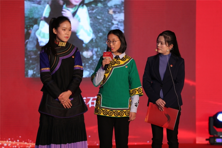 希望工程受助生代表沙马阿牛、巴足作石及凉山州越西县团委书记王国娟分享大凉山孩子们成长的故事。(主办方供图)