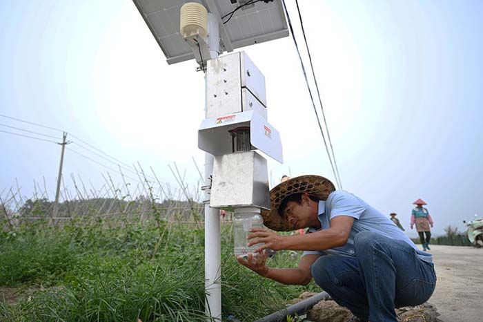 9月20日,在广西柳州市鱼峰区白沙镇王眉村,蔬菜专业合作社负责人覃保林观察害虫智能化捕捉设备运行情况。