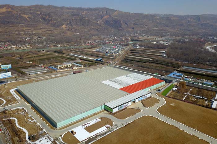 这是2月23日在和政县三合镇石虎家村拍摄的一家现代花卉产业园外景(无人机照片)。