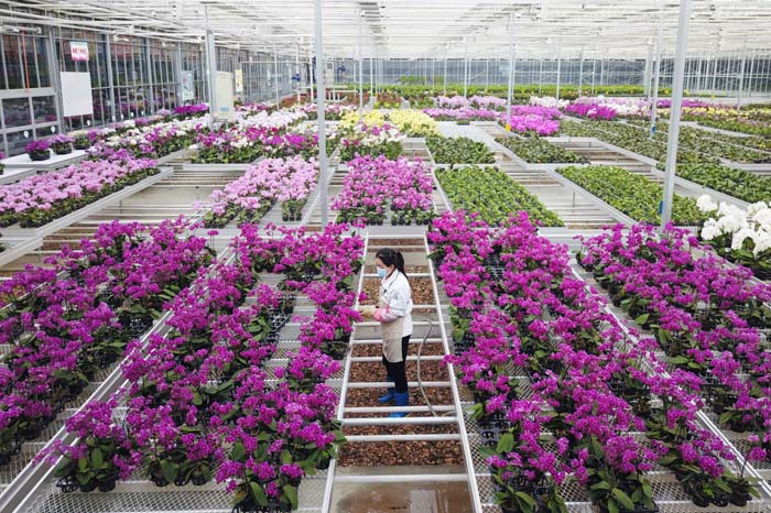 2月23日,在和政县一家现代花卉产业园,工作人员对花卉进行日常管护。 新华社记者范培珅 摄