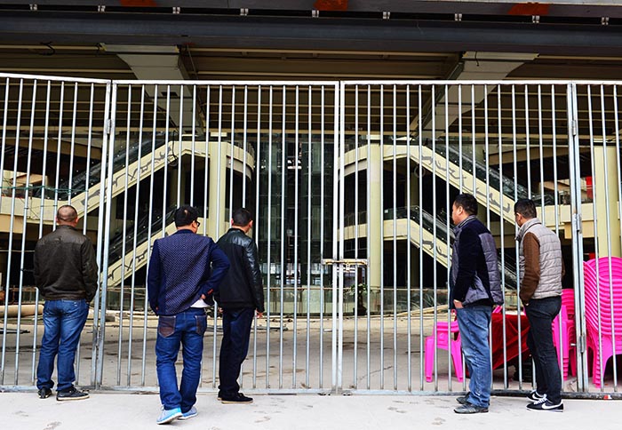 来自重庆的农民工张敏(左一)和他的工友们来到在莆田市城厢区曾经工作过的工地(1月20日摄)。