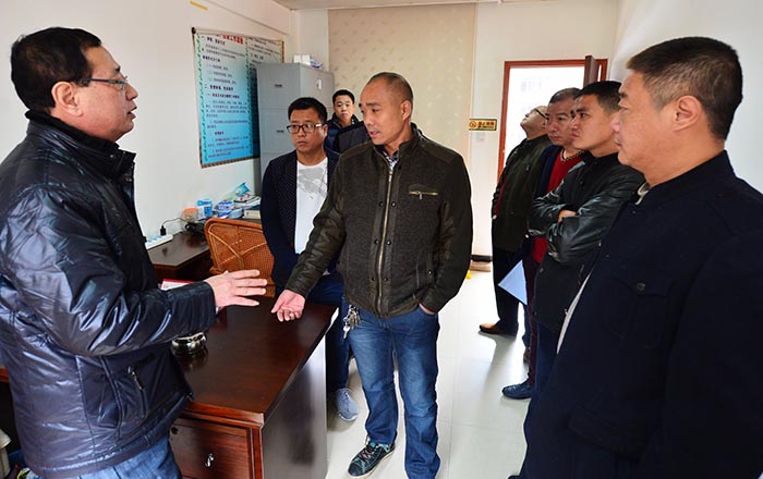 1月20日,在莆田市劳动保障监察支队监察室,监察员林玉坤(左一)在向张敏(中)和其他劳务分包负责人讲解欠薪讨薪的政策法规。
