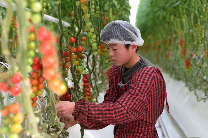 1月13日,在古浪县黄花滩生态移民区富民新村现代化智能玻璃温室,村民在管护串番茄。