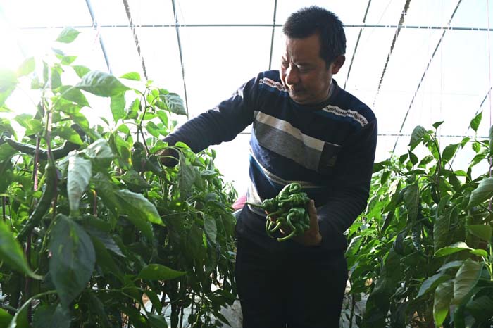 1月13日,村民在古浪县黄花滩生态移民区富民新村日光温室大棚内采摘辣椒。 新华社记者范培珅 摄