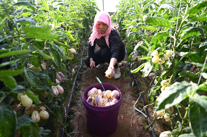 1月13日,村民在古浪县黄花滩生态移民区富民新村日光温室大棚内采摘人参果。 新华社记者范培珅 摄