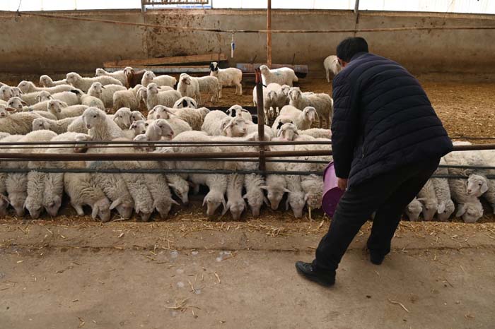 1月13日,村民在古浪县黄花滩生态移民区富民新村养殖暖棚给羊喂草。 新华社记者范培珅 摄