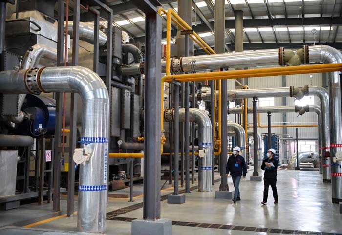 11月10日,在石家庄市一家供热企业,工作人员在运行车间内巡查。
