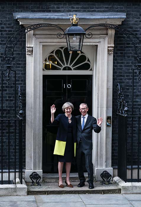 7月13日,在英国伦敦,英国新首相特雷莎·梅(前右)与丈夫来到唐宁街10号首相府。 新华社记者韩岩 摄