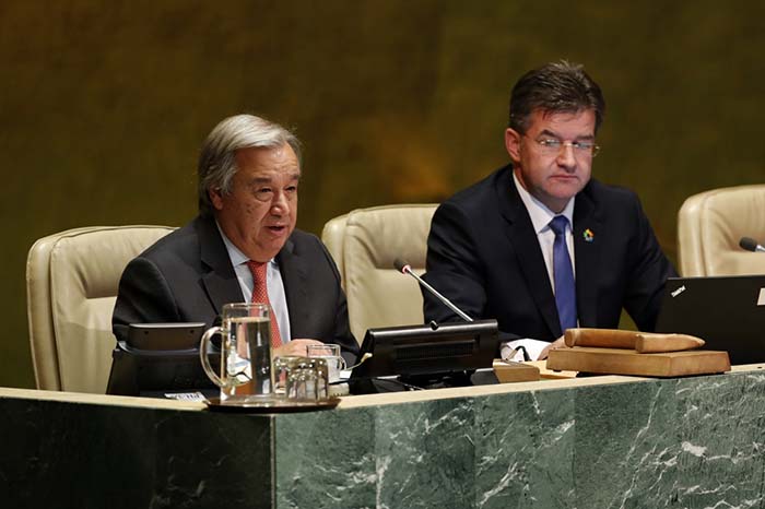 9月12日,在位于纽约的联合国总部,联合国秘书长古特雷斯(左)在第72届联合国大会开幕式上讲话。 新华社记者李木子 摄