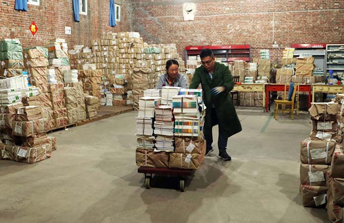 8月27日凌晨,石家庄井陉县新华书店工作人员在仓库将教材装车配送。 新华社发(张秀科 摄)