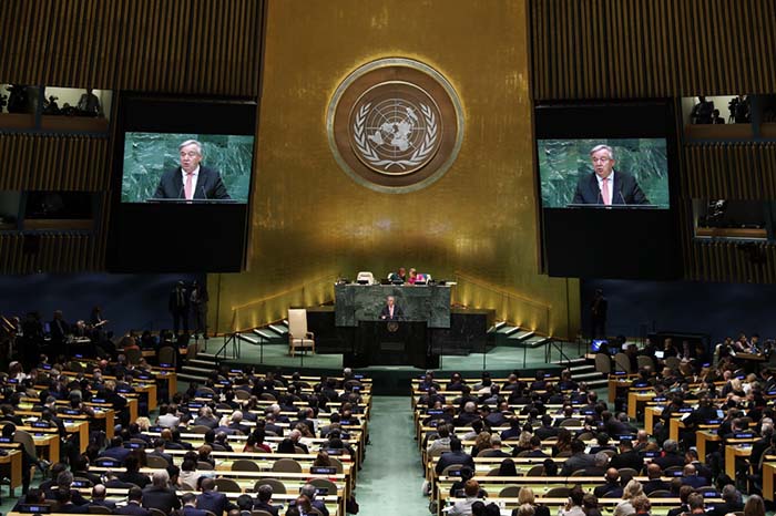 9月25日,在位于纽约的联合国总部,联合国秘书长古特雷斯(中)在联合国大会一般性辩论上发表演讲。