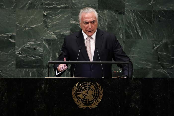 9月25日,在位于纽约的联合国总部,巴西总统特梅尔在联合国大会一般性辩论上发表演讲。 新华社记者李木子 摄