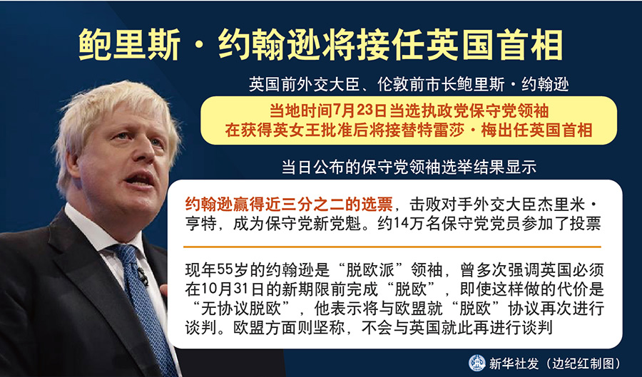 当日公布的保守党领袖选举结果显示,约翰逊赢得近三分之二的选票,击败对手外交大臣杰里米·亨特,成为保守党新党魁。约14万名保守党党员参加了投票。
