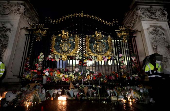 这是9月8日在英国伦敦的白金汉宫外拍摄的鲜花和蜡烛。 新华社记者李颖 摄
