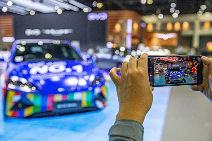 3月27日,一名观众在泰国曼谷国际车展上拍摄比亚迪海豹汽车。新华社记者 王腾摄