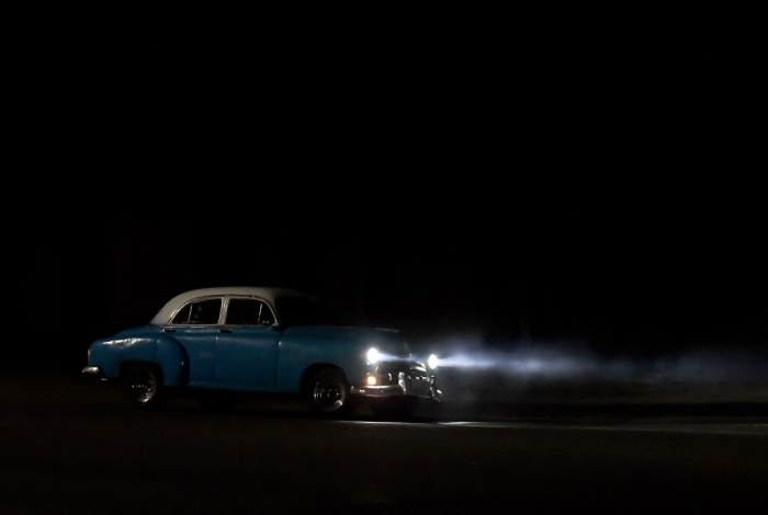 2月15日,在古巴首都哈瓦那,一辆老式汽车在黑暗街道上行驶。新华社发(华金·埃尔南德斯 摄)