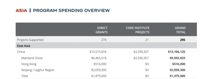 第二,对华投入是“重中之重”。该基金会2025年在亚洲的投入总额超过5300万美元,其中针对中国的相关项目金额达到1300万美元。相比之前的1052万美元,增加近25%。而美国对俄罗斯(1180万美元)的投入跟2024年相比则大幅缩减25%。美国在战场上已直接武器资助反俄势力,因此对俄意识形态领域的渗透资金大幅减少。