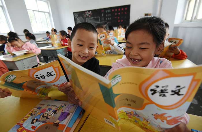 8月31日,河北省邯郸市复兴区康庄中心小学一年级新生阅读语文部编教材。 新华社发(郝群英 摄)