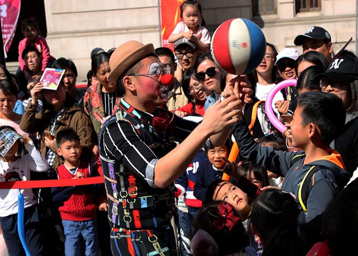 10月28日,街头艺人扮成小丑在活动的集市区里与小观众互动。 新华社记者刘颖 摄