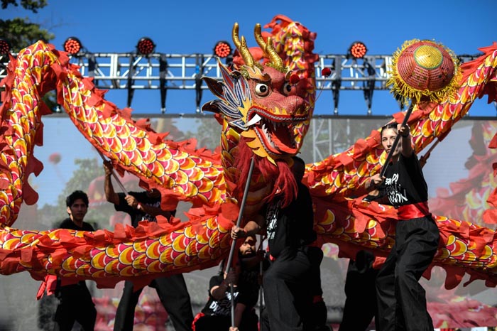 1月13日,演员在智利圣地亚哥举行的春节庆祝活动上表演舞龙。 新华社发(豪尔赫·比列加斯 摄)