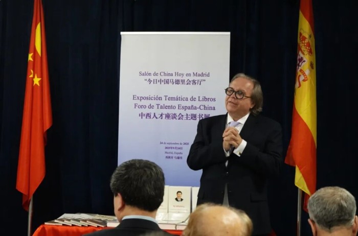 9月24日,“今日中国马德里会客厅”中西人才座谈会在西班牙马德里举行。中国外文局西欧与非洲传播中心(今日中国杂志社)主任赵丽君,北京市委组织部副部长、市人才工作局局长张若冰,西班牙中国友好协会主席安东尼奥•米格尔•卡尔莫纳(Antonio Miguel Carmona),欧洲议会议员哈维尔•纳特(Javier Nart),马德里大学理事会秘书长阿尔瓦罗·科斯塔斯(Álvaro Costas)等来自中国、西班牙的40余位政府、媒体、智库、学者代表参加本次座谈会。