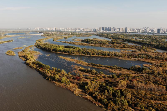 这是10月7日拍摄的哈尔滨金河湾湿地公园景色(无人机照片)。新华社记者王松 摄